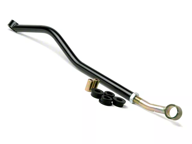 Construction and Appearance. Constructed from premium-grade alloy steel, this track bar boasts durability and strength, with a black powder-coated finish for added corrosion and rust resistance. What's more? It features Dura-Thane poly bushings for enhanced stability and vibration reduction, making it suitable for tough driving conditions.