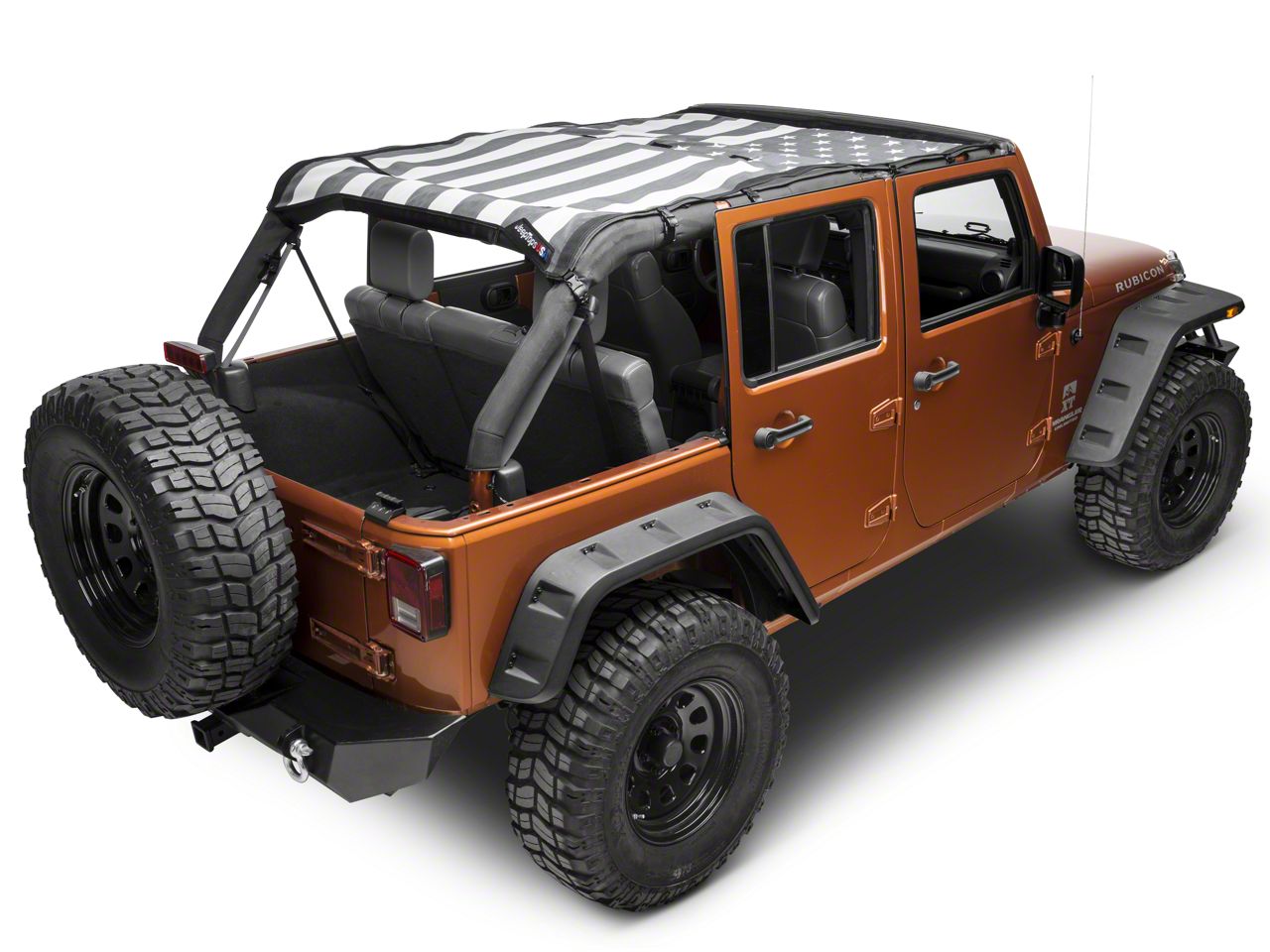 Application. The Tactical US Flag JTopsUSA Mesh Shade Top fits all 2007-2018 Jeep Wrangler JK 4-door models.
