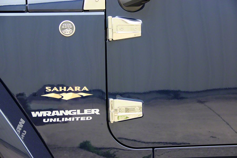 Premium Replacement Hinges. The Door Hinge Set; Polished provides durable and aesthetically pleasing door hinges for Jeep Wrangler JK 2-Door models. These hinges replace worn or damaged factory parts, ensuring secure and smooth door operation. They are essential components that maintain the structural integrity and proper alignment of the doors.