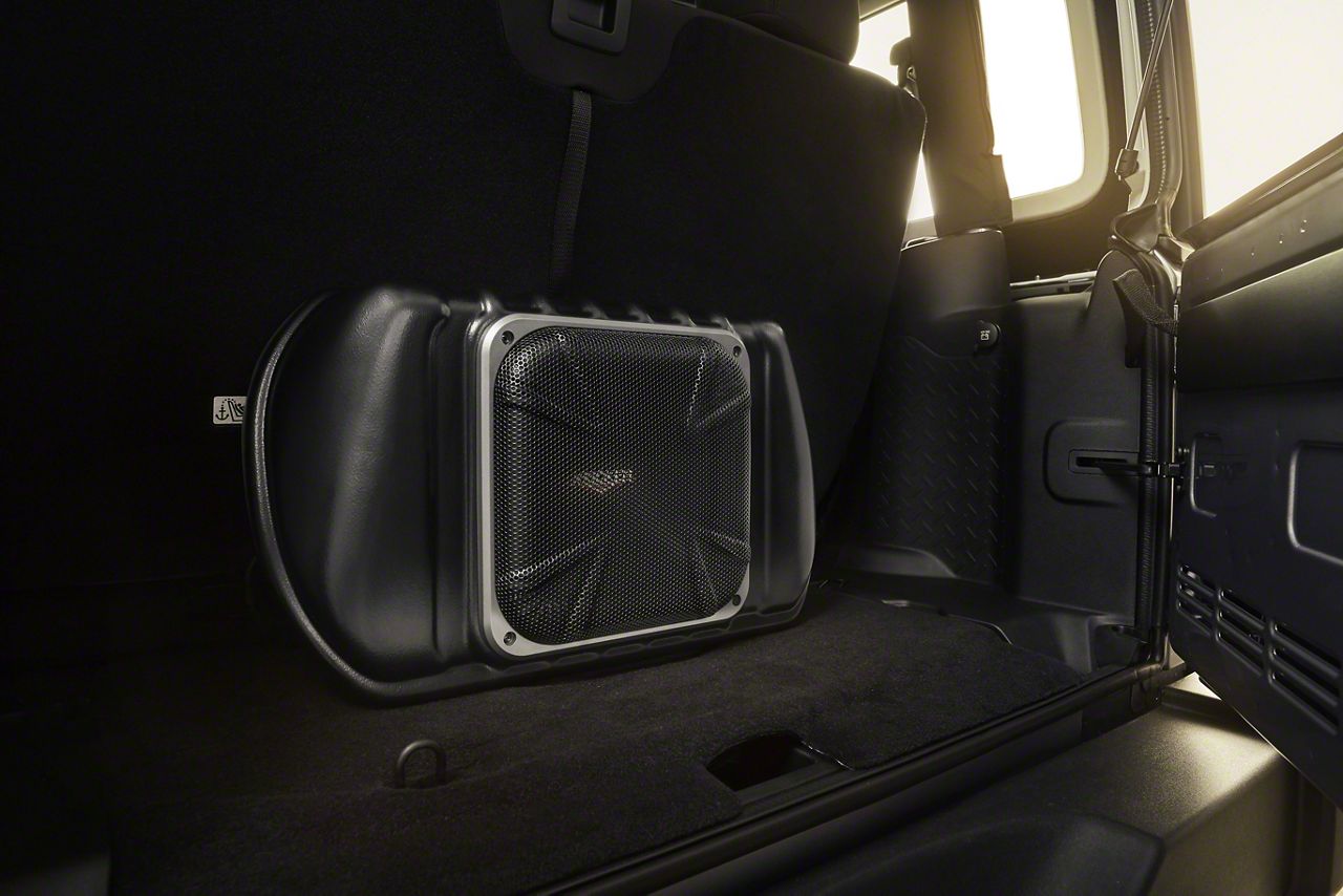 Durable Construction. The Kicker PowerStage Vehicle Specific Solution System is factory-engineered to supplement the existing sound system of the Wrangler. Each VSS PowerStage kit has a custom-fit, 10-inch square subwoofer that comes with molded plastic enclosure that directly fits on the back rear seat. In addition, the VSS PowerStage features a multi-channel digital signal processor and a 200-watt subwoofer amplifier to provide a powerful sound system.