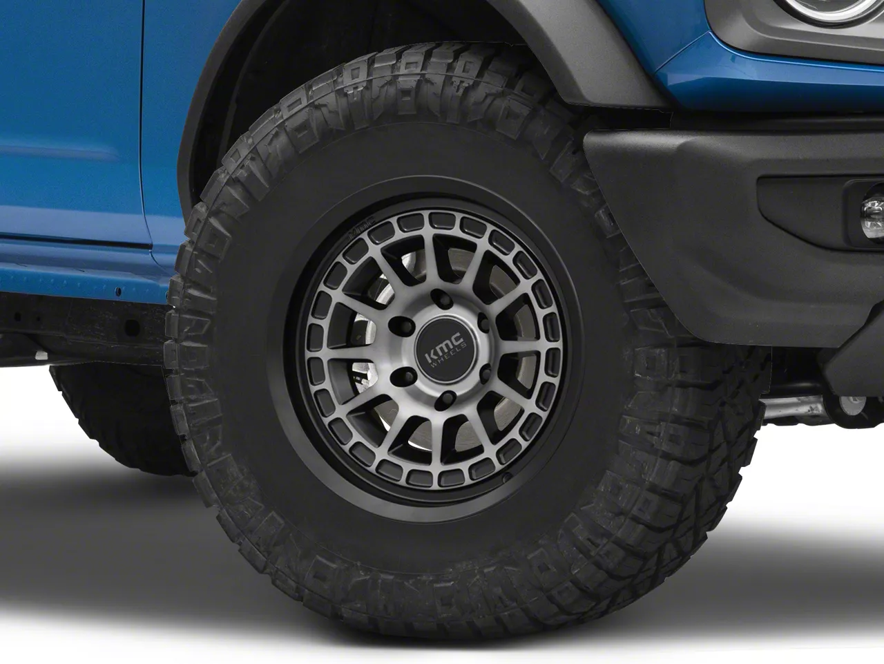 Application. This KMC Canyon Satin Black with Gray Tint 6-Lug Wheel; 17x8.5; 0mm Offset, with a backspacing of 4.75 Inch, 120.6mm and a bolt pattern of 6 x 139.7mm (6 x 5.5-Inch), offers superior alignment and stability. It's precisely engineered to enhance your vehicle's performance. Designed to fit 2021-2026 Bronco, Excluding Raptor models, it ensures a perfect fit and impeccable style. Sold individually.
