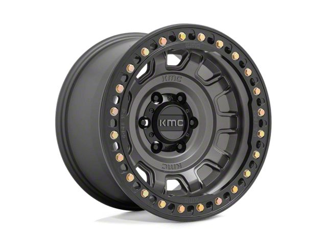 KMC Tank Beadlock Anthracite 6-Lug Wheel; 17x9; -38mm Offset offers a striking balance between style and durability. The design speaks to the brand's commitment to quality, enhancing the vehicle's appearance with its distinct look. This wheel, with its unique aesthetics, is ideal for drivers who appreciate a blend of modern design and robust functionality.