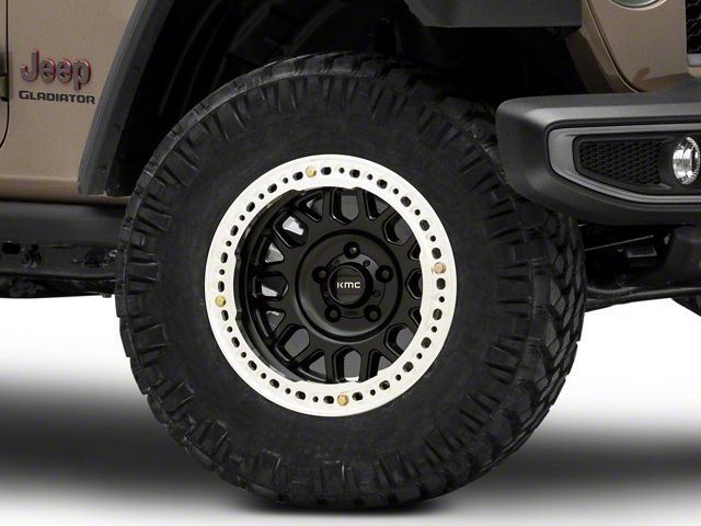 The KMC Grenade Crawl Beadlock Satin Black Wheel; 17x8.5 embodies sophistication and durability. Its design resonates with vehicular aesthetics, making it a top choice for those seeking a harmonious blend of style and strength.