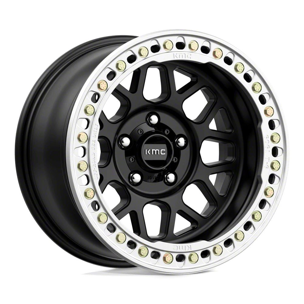 KMC Grenade Crawl Beadlock Satin Black Wheel; 18x9 The KMC Grenade Crawl Beadlock Satin Black Wheel combines a sleek, sophisticated design with premium construction that enhances the visual appeal and complements a wide range of vehicle styles. This wheel is perfect for those seeking to make a bold statement while maintaining elegance and robustness.