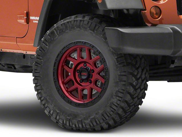 Application. This KMC Mesa Candy Red with Black Lip Wheel; 17x9, with a backspace of 5.709 Inch, 145mm; and bolt pattern of 5 x 127mm (5 x 5-Inch), is designed to fit the 2007-2018 Jeep Wrangler JK . The precise specifications of the wheel ensure proper alignment and driving stability, perfectly complementing the vehicle's model. Sold individually.