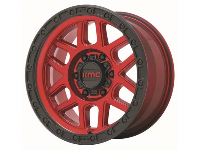 KMC Mesa Candy Red with Black Lip 6-Lug Wheel; 20x9; 18mm Offset offers a striking balance between style and durability. The design speaks to the brand's commitment to quality, enhancing the vehicle's appearance with its distinct look. This wheel, with its unique aesthetics, is ideal for drivers who appreciate a blend of modern design and robust functionality.