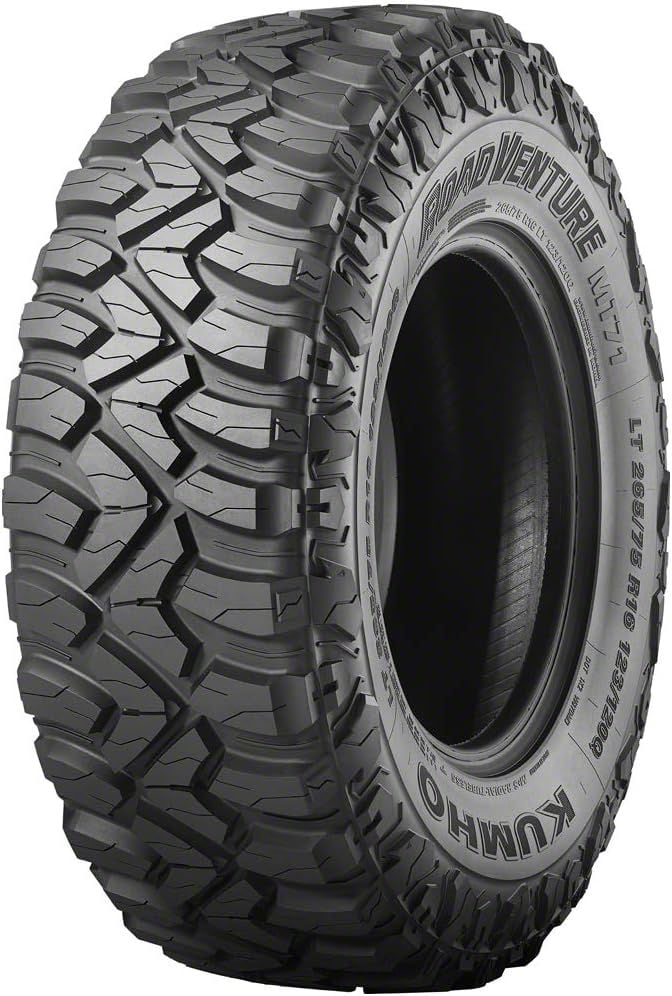 The Road Venture MT71 is Kumho's Off-Road Maximum Traction tire built for the drivers of pickup trucks, full-size SUVs, Jeeps and other capable all-terrain vehicles looking to conquer tough off-road conditions while retaining on-road competence and highway stability.Kumho Road Venture MT71 CalloutsKumho utilizes an advanced Tri-Blended tread compound optimized for durability and long tread life while providing enhanced grip on pavement and in loose terrain conditions. The proprietary polymer mix is engineered to endure the severe conditions encountered while hauling heavy payloads and provide cut-and-chip resistance in extreme off-road landscapes. The high-void, zig-zag dual-pitch tread design helps ensure maximum loose surface traction and employs mud and stone ejectors molded in between blocks that help prevent damage from stone drilling and aid self-cleaning of packed debris. The tire's aggressive shoulder and sidewall design features robust biting edges that help provide powerful off-axis traction and increased sidewall protection. Stiffened tread elements continue to enhance off-road performance while also retaining a consistent contact patch for predictable handling on-road.