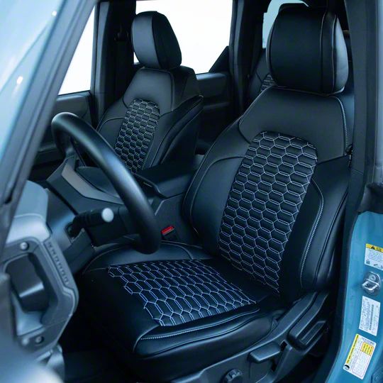Stylish and Durable Seat Protection. The Kustom Interior Premium Artificial Leather Front and Rear Seat Covers offer a tailored fit and sleek design for your Bronco, enhancing both the look and feel of your vehicle's interior. The all-black design with double hex stitch accent inserts adds a touch of sophistication, while the premium artificial leather material ensures durability and ease of maintenance.