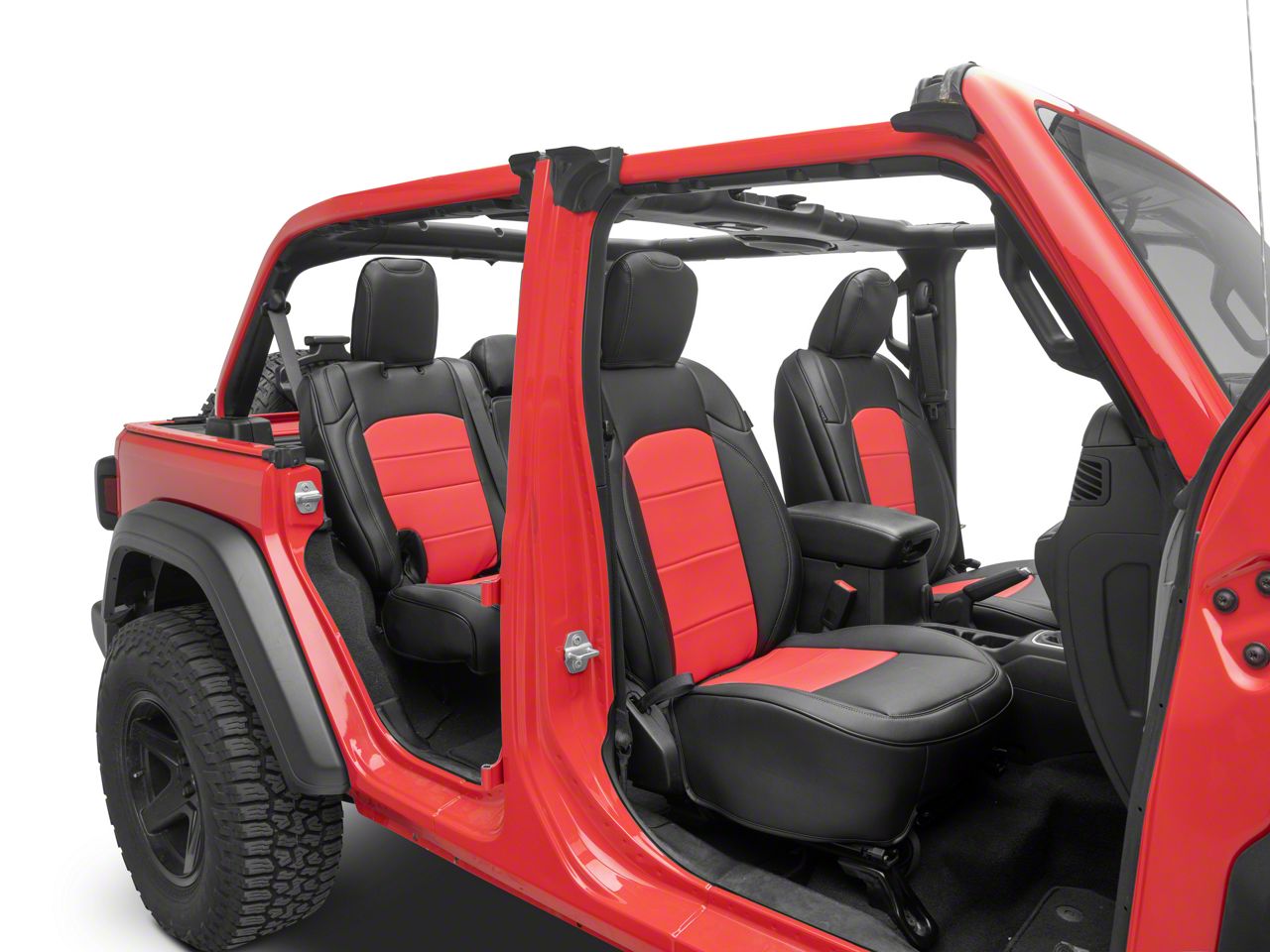 Application. The Kustom Interior Premium Artificial Leather Front and Rear Seat Covers; Black with Red Accent fits 2018-2026 Jeep Wrangler JL 4-Door models without power seats.