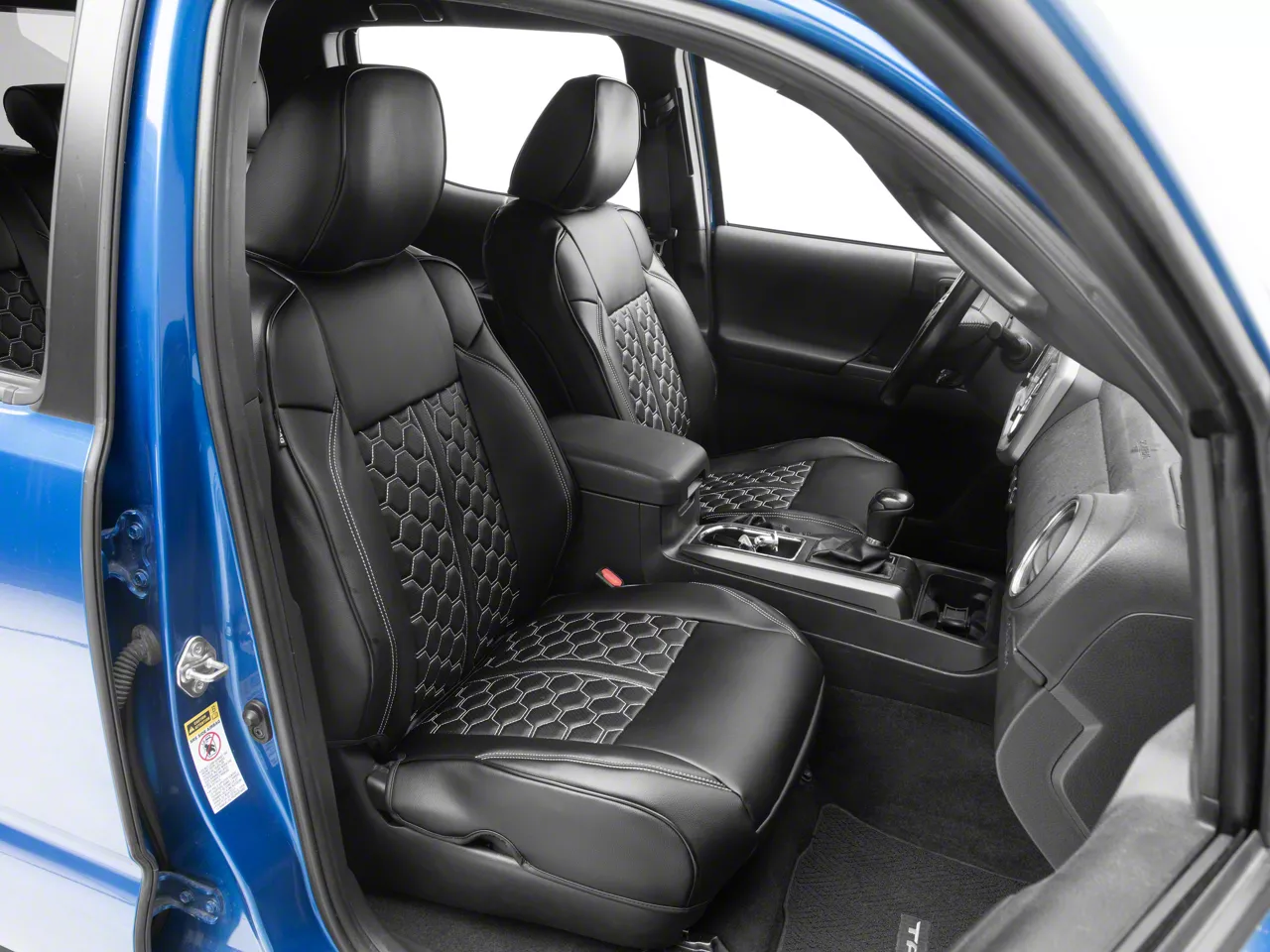 Elegance and Comfort. Transform the interior of your Tacoma Double Cab with the Kustom Interior Premium Artificial Leather Front and Rear Seat Covers; All Black. Crafted from premium artificial leather, these seat covers offer the luxurious look and feel of genuine leather while being more sustainable and easier to maintain. The all-black design is elegantly accented with white stitching, adding a touch of sophistication to your Tacoma's interior. The honeycomb pattern detail further enhances the aesthetic appeal, providing a modern and stylish look.