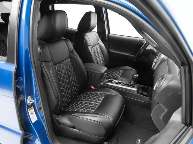 Application. The Kustom Interior Premium Artificial Leather Front and Rear Seat Covers; All Black with White Stitching Honeycomb Accent fits 2016-2023 Tacoma Double Cab models.