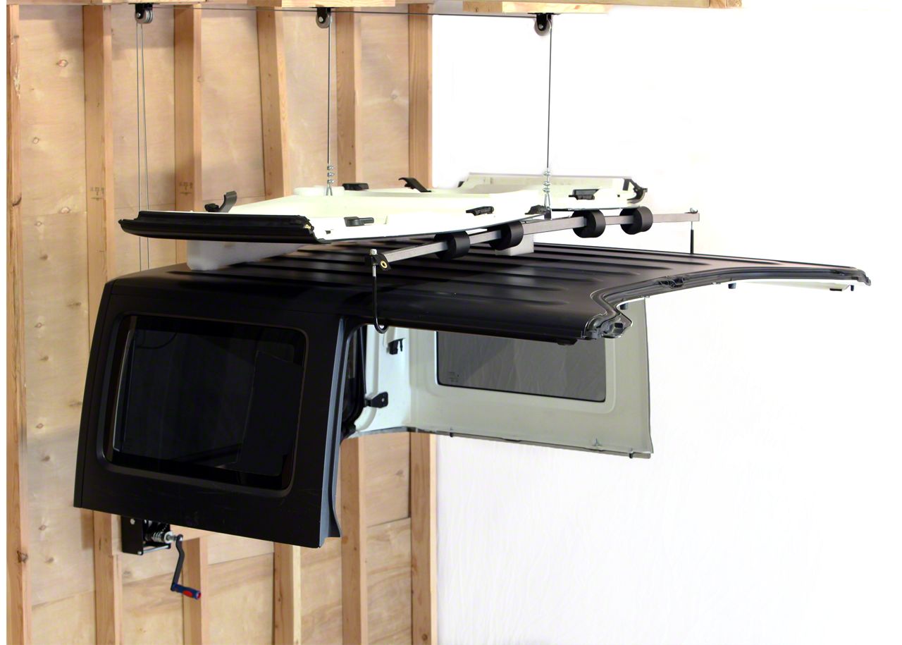 Easy Hardtop Removal and Storage. Now you can easily remove and store your Wrangler's hardtop all by yourself in just minutes with Lange's Crank Hoist-A-Top. This Hoist-A-Top is a must have for any Jeep owner who wants to lift off and store their hard top at ceiling level in their own garage or carport. You won't have to worry about pulled muscles, strained backs, or dropped tops when you use this complete system.