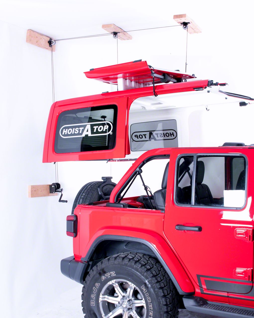 Top-Notch Function. Using Lange's Crank Hoist-A-Top means that you'll never have to worry about straining your back muscles or dropping your Jeep Wrangler JLs top when you want to remove it in good weather. Instead, this Hoist-A-Top allows for quick and easy removal and storage so you can remove the top on your own in minutes and leave it stored at ceiling level in your garage or carport.