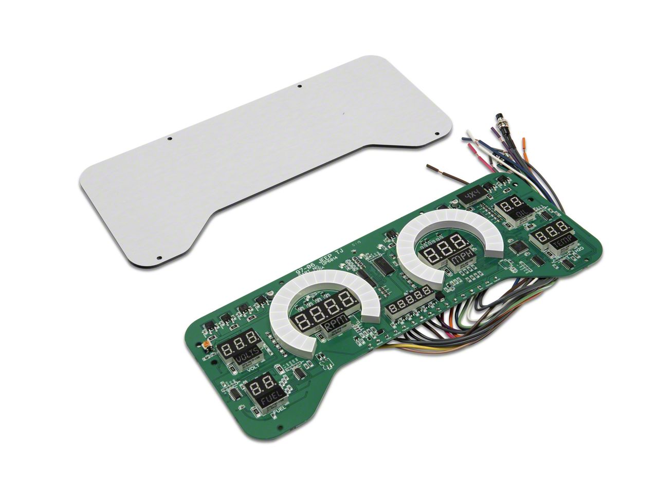 Digital Red LED Gauge Panel. This visually striking and fully functional Red LED Digital Gauge Panel is an excellent way to update your 1997-2006 TJ Wrangler's interior. This Gauge Panel boasts bright red LED illumination and a dark smoked Plexiglas faceplate for impressive good looks. With its sleek, futuristic design you can't but marvel at your dashboard every time you start your engine.