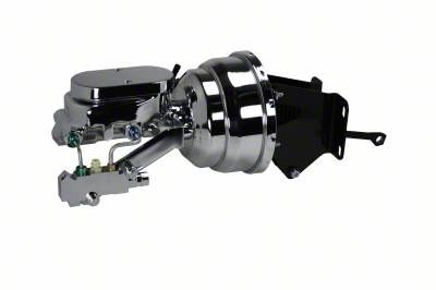 New 8" Dual Diaphragm chrome plated power brake booster , master cylinder & front disc / rear drum proportioning valve combo. This 8" power booster is hand polished before a chrome finish is applied for a top quality finish. The black powder coated mount and pushrod assembly is a direct fit to your factory firewall for that fresh factory look. Also included in this kits is a new 1" bore master cylinder and proportioning valve equipped to work with front disc rear drum brake applications.