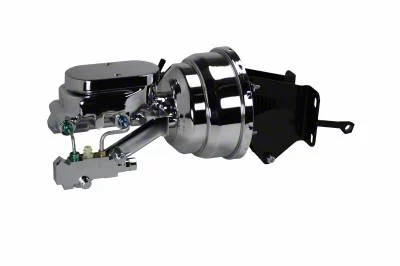 New 8" Dual Diaphragm chrome plated power brake booster , master cylinder & 4 wheel disc brake proportioning valve combo. This 8" power booster is hand polished before a chrome finish is applied for a top quality finish. The black powder coated mount and pushrod assembly is a direct fit to your factory firewall for that fresh factory look. Also included in this kits is a new 1" bore master cylinder and proportioning valve equipped to work with 4 wheel disc brake applications.