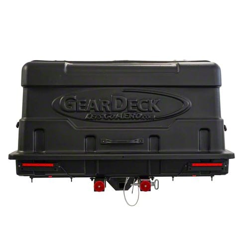 Let’s Go Aero GearDeck® slideout enclosed hitch mounted carrier provides a generous 17 cubic foot capacity for hauling both travel cargo and utility equipment including generators popular on RV towables, truck campers, and mid-sized vehicles. The slide-out feature clears SUV hatches, tailgates, and Sprinter RV doors with a strong and stable dual-tube frame design for demanding off road terrains and fifth wheel and travel trailer tow environments.