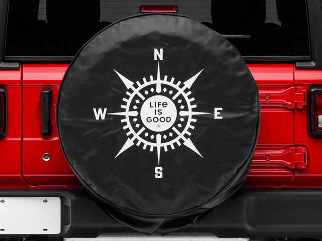 Cover Your Spare Tire in Style. Add a dash of style to your Jeep and protect your spare tire from premature exposure to the elements by covering it with this Life is Good LIG Compass Spare Tire Cover in Night Black. This Spare Tire Cover is as stylish as it is practical. It features a white compass design with the Life is Good branding at the very center, contrasting with the dark, heavy-duty fabric that can withstand the barrage of the elements.