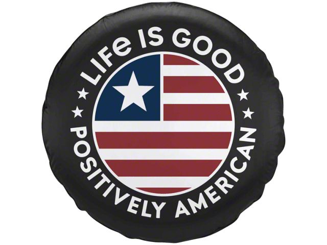 American Design. This spare tire cover features the Life is Good - Positively American tagline with a circular flag logo, cushioning your wheel and tire with American spirit.