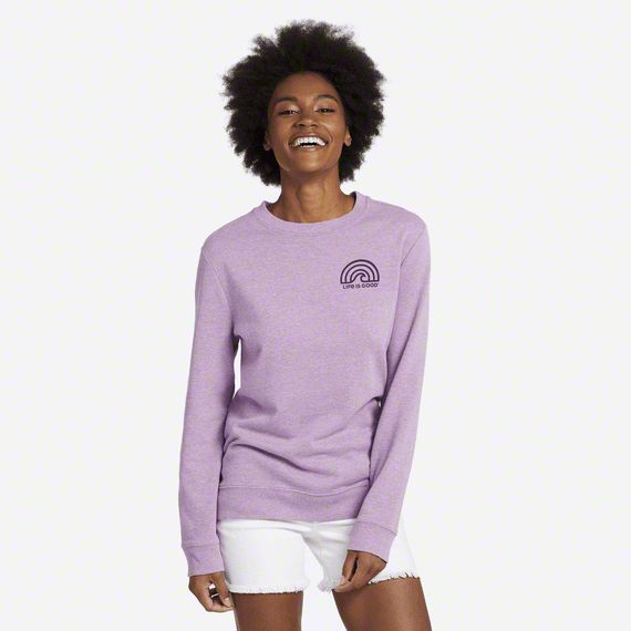 Delivers a Vintage Touch. The Life is Good Women’s Happy Grape Sunset Wave Simply Crew Shirt boasts a classic fit that gives you a flattering silhouette. It also comes in a soft Happy Grape color to create that weathered, vintage look and feel. What’s more, it features a loosely knit rib trim to help complete its unique appeal.
