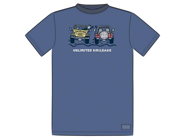 Unlimited Fun, Unlimited Smileage. This Life is Good Men's Jackie Unlimited Crusher T-Shirt in Blue comes with a design that evokes fun with its clever play of words in its printed “Unlimited Smileage” tagline. Its colorful cartoon artwork depicts a pair of Jeeps on a rugged road over a blue background. Get one now to wear on your next off-road adventure.