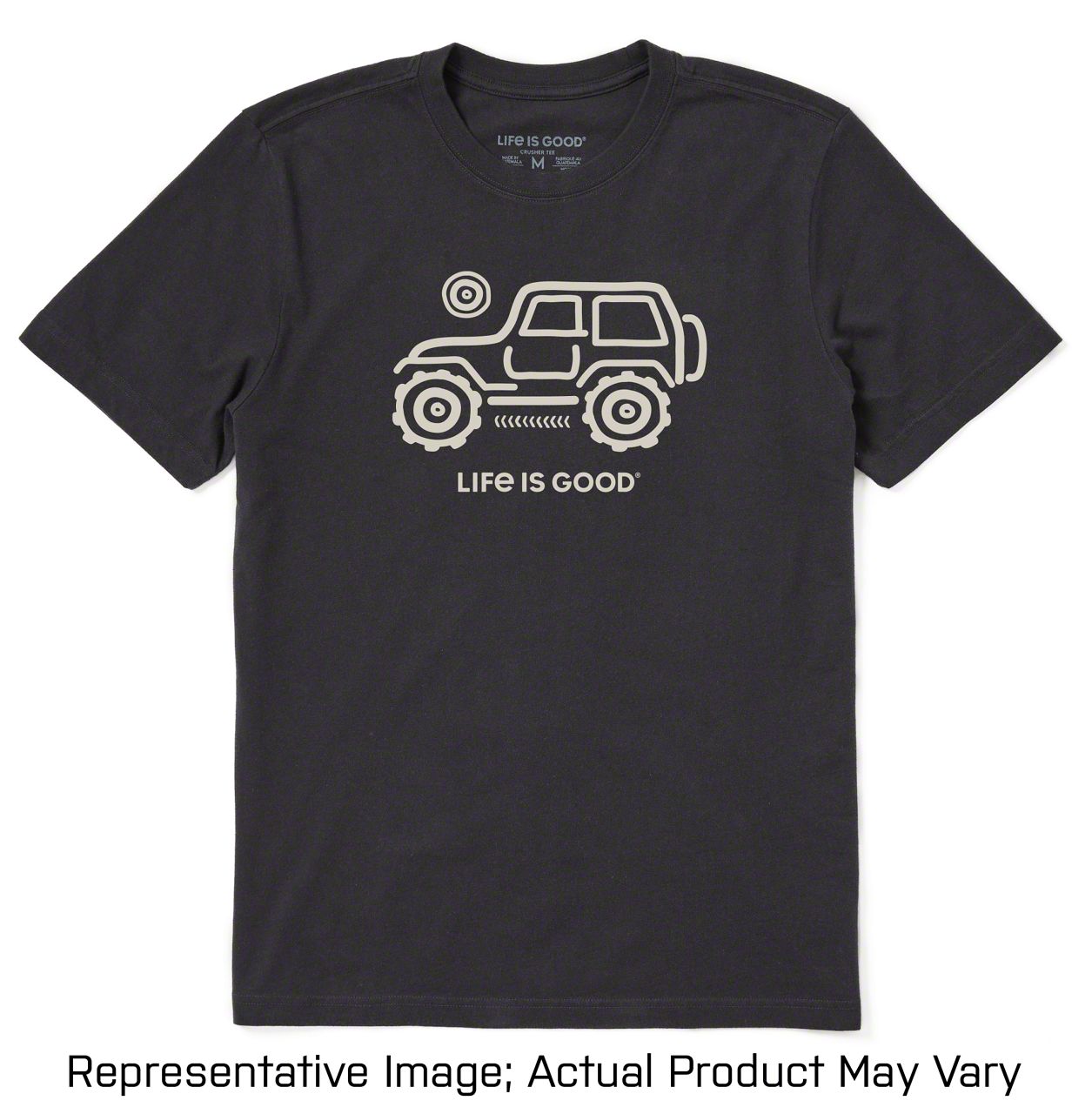 Jeep-Inspired Graphic. This Life is Good Men’s Native Off-Road Crusher T-Shirt sports a Jeep-inspired graphic design. It is printed with a simplistic Jeep vector art that comes with the “Life is Good” logo underneath. With this amazing design, you can proudly wear this heather gray-colored shirt as your exclusive off-road outfit.