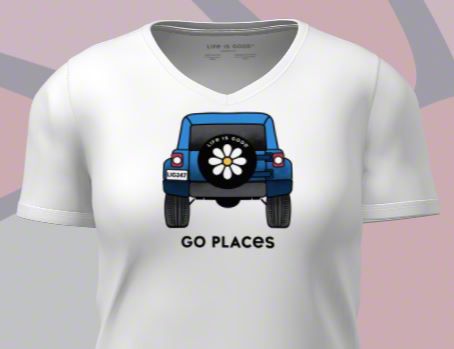 Go Places. This great looking Cloud White Short Sleeve V-Neck T-Shirt is a must have for all Jeep enthusiast. This graphic tee features a full color Life Is Good Daisy Crusher design with "Go Places" in black text below.