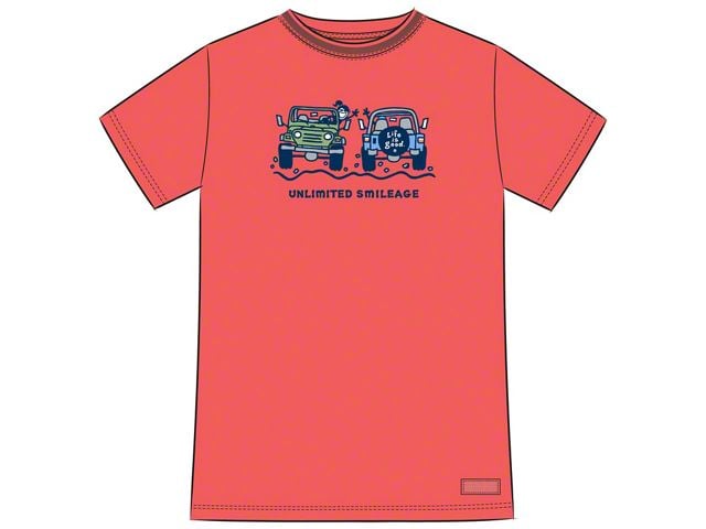 Unlimited Fun, Unlimited Smileage. This Life is Good Women's Jackie Unlimited Crusher-LITE T-Shirt in Orange features a design that promotes fun with its clever play of words in its “Unlimited Smileage” tagline. Its colorful artwork depicts a duo of Jeeps traversing a rugged road on an orange background. Get one now for your next trail adventure.