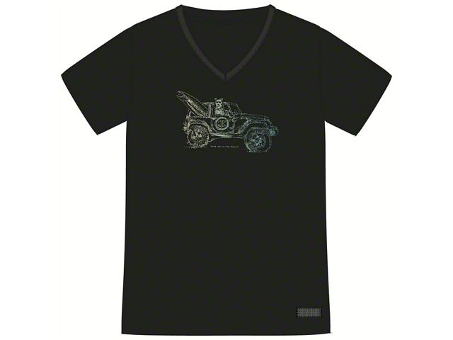 Lightweight, Laid-Back Style. This Life is Good Women's Take Me ATV Crusher-LITE VEE in Jet Black t-shirt is impressively laid-back and lightweight. It features a ribbed V-neck collar and a creative, printed artwork that displays a Jeep on an adventure. Without a doubt, this t-shirt is set to make you feel cooler in your next outdoor adventure.