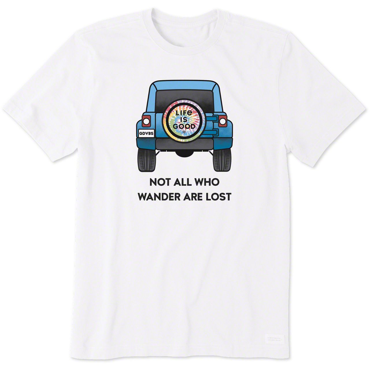 Not All Who Wander Are Lost. This great looking Cloud White Short Sleeve T-Shirt is a must have for all Jeep enthusiast. This graphic tee features a full color Tie Dye 4x4 Life Is Good Crusher design with "Not All Who Wander Are Lost" in black text below.