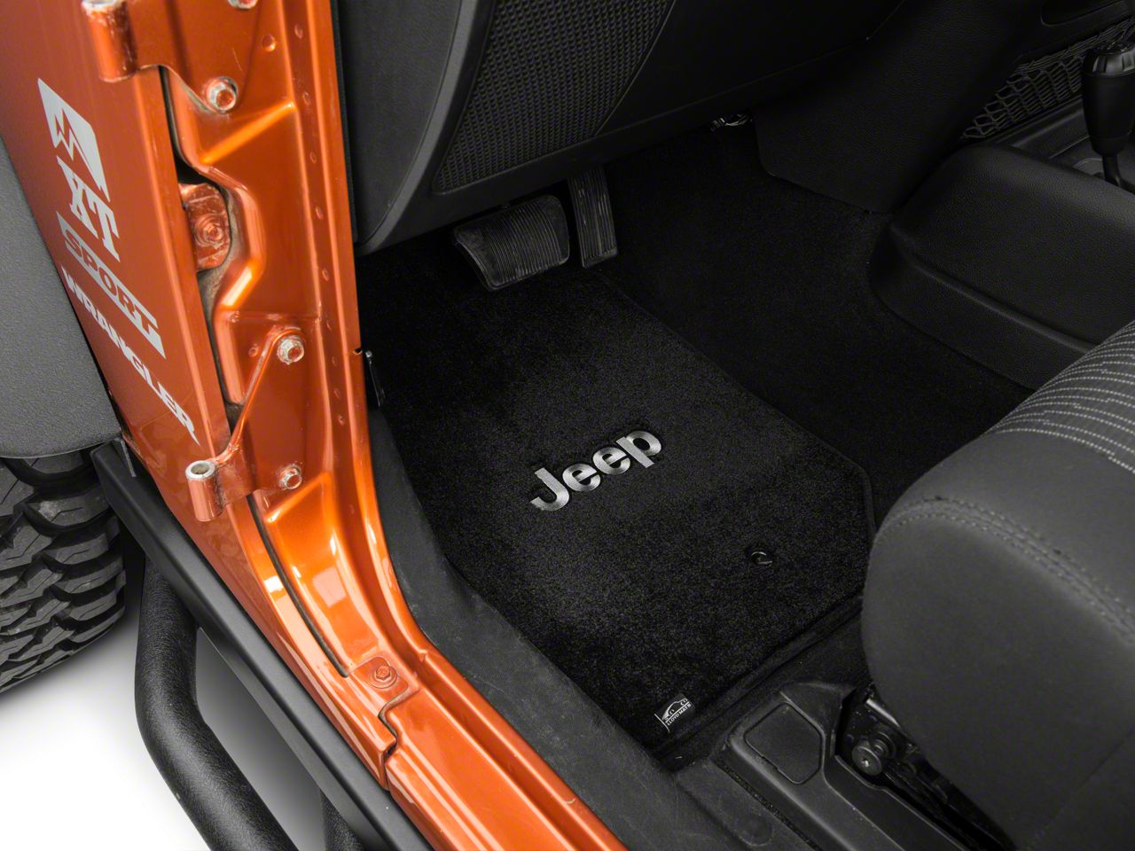 Intense Styling. Enhance your Jeep's interior with the Lloyd Front and Rear Jeep Logo Black Floor Mats. These sleek mats feature a durable construction and the Jeep brand logo embroidered in silver on the front mats for impressive OE-like styling that isn't found in your average interior package. They're custom fit to your Wrangler for superior coverage and protection without compromising the factory appearance.
