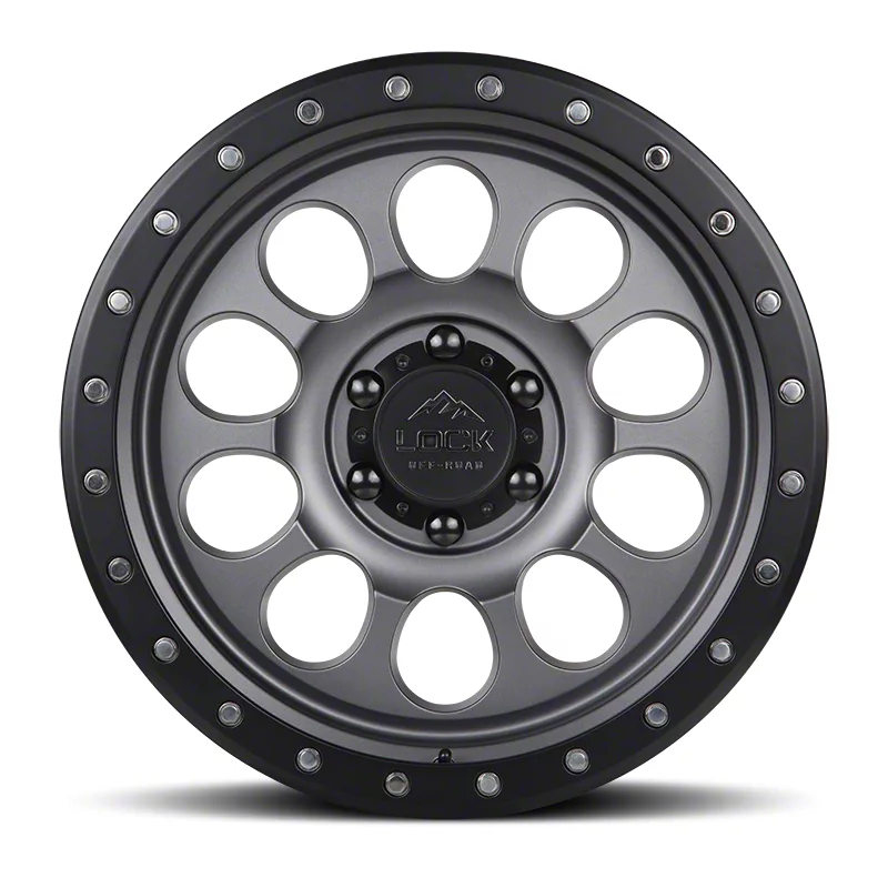 The 20x9 Lock Off-Road 50Cal Matte Grey with Matte Black Ring Wheel is completed in a matte gray finish with a matte black ring for an impressive appearance. For added protection and looks, there's a durable clear coat that withstands the hazards of everyday driving.