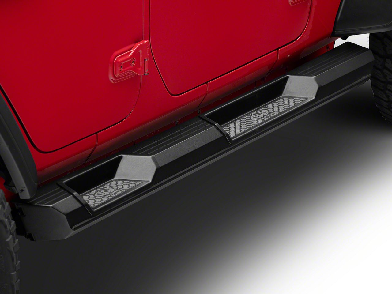 Heavy-Duty Build. Constructed from extruded aluminum, these Rocksliders are built to withstand the toughest of terrains and provide unbeatable protection for your Jeep's rocker panels. The durable black powder-coated finish not only adds corrosion resistance, but also adds an aggressive, stylish look that complements your Jeep's appearance.