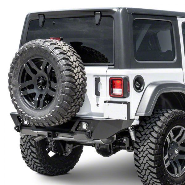 Feature-Loaded Bumper. This shorty bumper is never short on features. Check out the LoD Offroad Destroyer Shorty Rear Bumper in Black. This front bumper has a sleek design with fewer catch points, avoiding unnecessary troubles with rocks and obstacles on the road. It features an integrated tow hitch rated at 3,500 pounds, and this bumper can fit up to a 35-inch spare tire using the factory tire holder. It also allows you to add light bezels with up to 4-inch round lights.