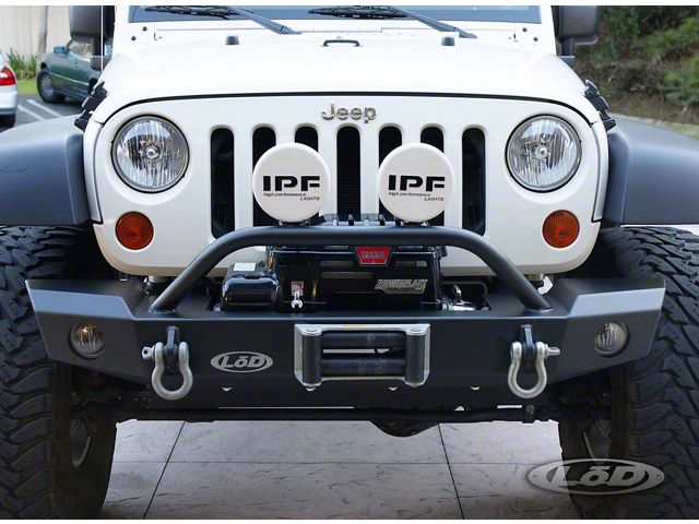 Description. The LoD Signature Series Front Bumper is constructed of 10 gauge, 3/16", and 1/4" steel. The bumper includes two clevis mounts and comes standard with a winch mounting plate. The winch mounting plate is constructed of 1/4" steel. The winch plate is designed to accept many of the popular winches including the Warn Powerplant. This bumper was designed to allow the winch to sit between the frame rails for added protection and improved air flow. Also optional on this bumper is a guard that comes standard with an auxiliary light mounting tab. The bumper also provides a way to mount the factory or aftermarket fog lights. An optional guard is also available, as well as a bolt-on skid plate for EVEN more added protection. You will have a choice of coating options. The semi-gloss black textured coating is a close match to the factory fender flares.