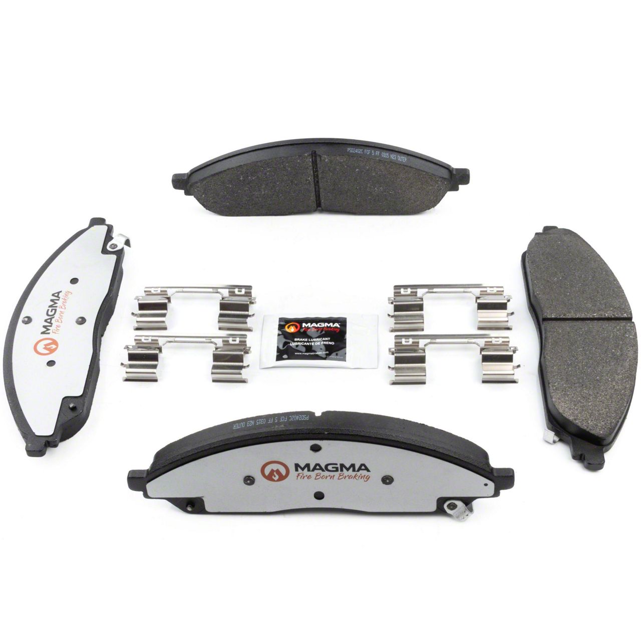 WHY MAGMA? - Today's harsh stop and go environment can create very high heat levels in your braking system which can reduce the vehicle's ability to stop. Extreme high temperatures can be reached in many braking situations such as - Stop and Go Traffic, Mountain Driving, Hauling or Towing, Emergency Stops, Spirited Driving and Long, Sustained Braking. At MAGMA Brakes, we use FIRE to fight FIRE. Our brake system components are made using advanced, state of the art techniques and treatments that ensure our brakes will stand up to the heat. MAGMA Pro-Series brake pads feature... 1. Scorched, copper free friction formulations for overall ltimate braking performance 2. Vulcanized OE style rubber core shims for unsurpassed noise suppression 3. Heat-tempered upgraded dual-coated stainless steel hardware kits to restore the brake pad to caliper interface to "like new" condition (where applicable) 4. Heat expansion OE style slots and chamfers to dissipate noise and stand up to the heat 5. High-heat resistant brake lubricant included for lubricating critical points during pad installation