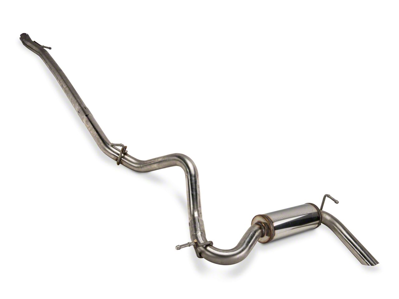 Design. This cat-back exhaust system includes an inlet pipe, an over axle pipe, muffler assembly and clamps. The pipes are mandrel bent and welded to promote superior flow of the exhaust gas.