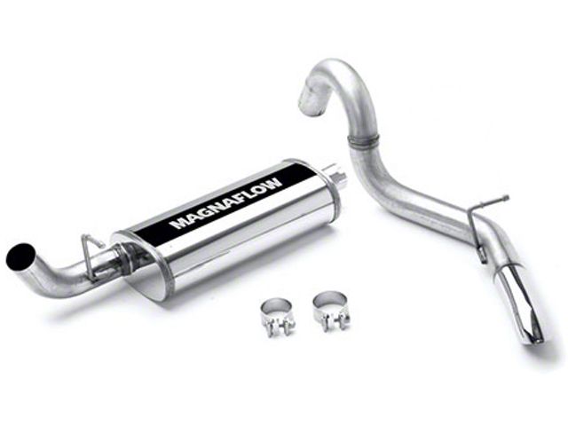 Design. The MagnaFlow Street Series Cat-Back Exhaust System is made of 100% polished stainless steel. Its sturdy lap-joint welded construction adds to the strength. This exhaust system features a free flowing, straight-through perforated stainless steel core, mesh wrap and an acoustical fiber fill to produce a smooth and deep exhaust sound.