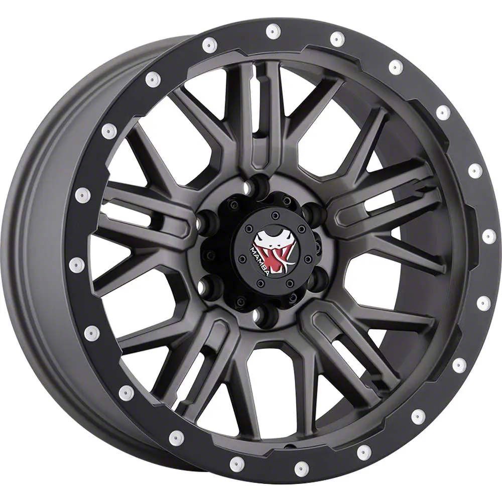 Mamba Offroad Wheels M25 Matte Grey with Black Lip Edge 6-Lug Wheel; 17x9; 12mm Offset is a perfect blend of style and rugged design, making it a standout choice for those looking to enhance their vehicle's aesthetic appeal. Its bold, dark metallic finish pairs seamlessly with a wide variety of vehicle styles, offering both modernity and durability. Built by Mamba Offroad Wheels, this wheel is designed to elevate your vehicle's appearance with its robust presence.