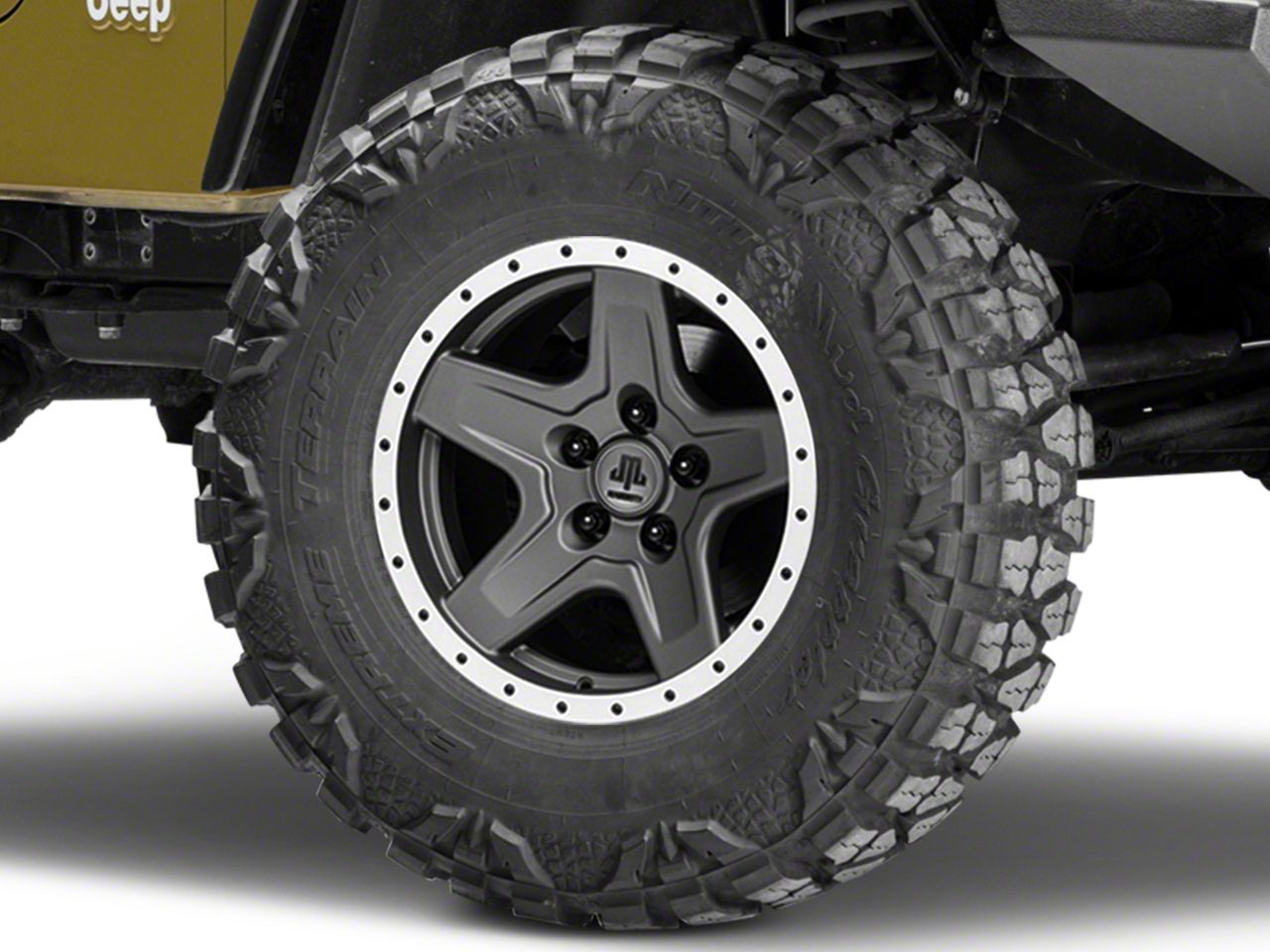Application. This Mammoth Boulder Simulated Beadlock Style Charcoal Wheel; 16x8 with a backspace of 4.5 Inch, 114.3mm and bolt pattern of 5 x 114.3mm (5 x 4.5-Inch) ensures impeccable alignment and unmatched driving stability. Specifically designed for 97-06 Jeep Wrangler TJ models, each wheel is sold individually.
