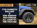 Application. This 17x9 Mammoth Boulder & Ironman Mud-Terrain All Country Tire Package is designed to fit 2020-2026 Jeep Gladiator JT models.