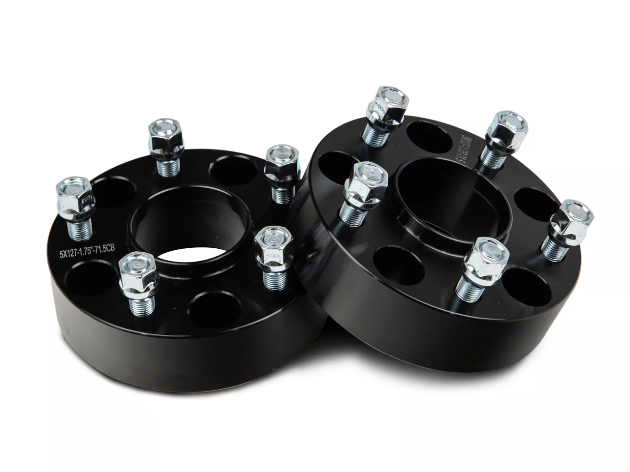 Application. These Mammoth 1.75-Inch Billet Wheel Spacers; Black are designed to fit 2018-2026 Jeep Wrangler JL models equipped with 5 lug, 5 x 5-inch (5 x 127mm) factory or aftermarket wheels. Sold as a set of 2 Wheel Spacers.