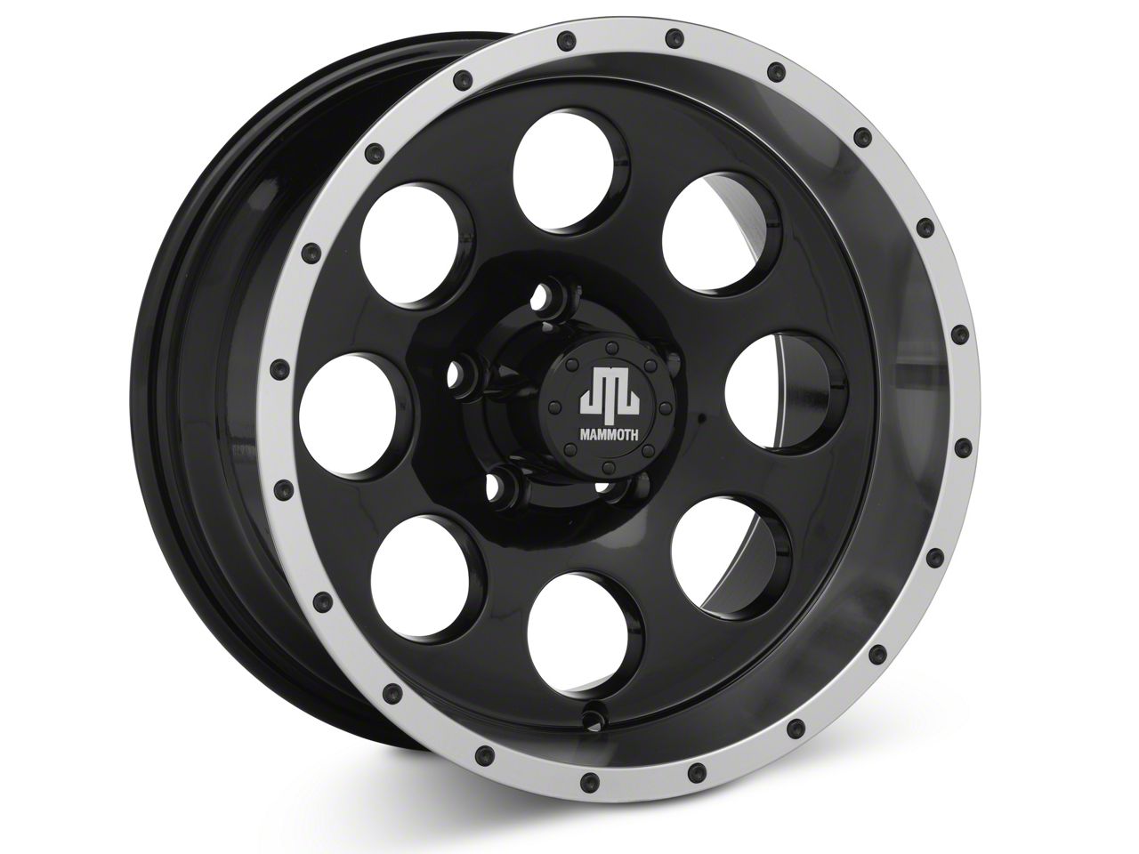 Mammoth 8 Simulated Beadlock Style Black Wheel; 15x8 exhibits an exquisite finish, adding a touch of elegance to your vehicle. The design complements a range of vehicle styles, with its robust build making it a standout choice for enthusiasts who value both aesthetics and durability.