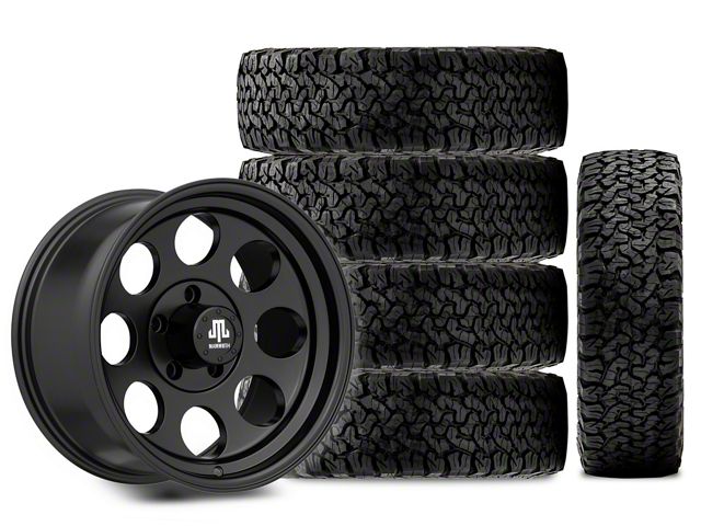 Mounted and Balanced Wheel and Tire Kit. This wheel and tire combo kit features (5) 17x9 Mammoth 8 Aluminum Matte Black Wheels and (5) BF Goodrich All-Terrain T/A KO2 285/70R17 tires that have been put together into an easy to buy kit that arrives to your door already mounted and balanced ready to be installed on your vehicle.