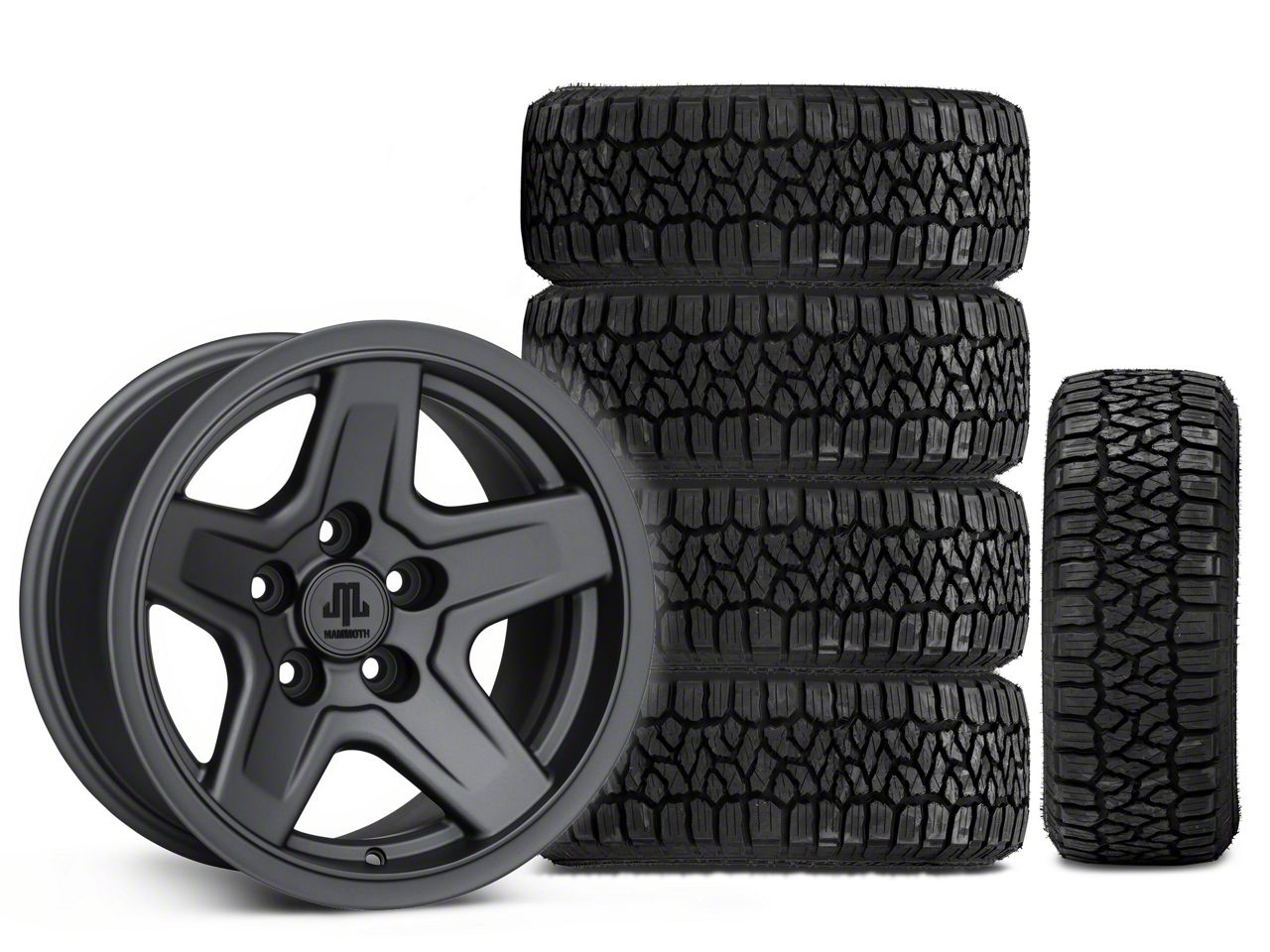 Mounted and Balanced Wheel and Tire Kit. This wheel and tire combo kit features (5) 15x8 Mammoth Boulder Charcoal Wheels and (5) Kenda KLEVER A/T2 KR628 33x12.50R15 tires that have been put together into an easy to buy kit that arrives to your door already mounted and balanced ready to be installed on your vehicle.