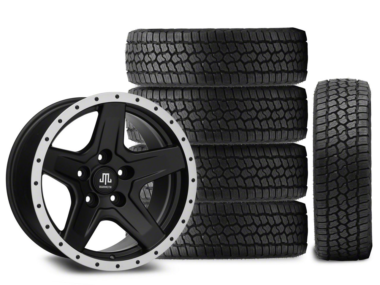 Mounted and Balanced Wheel and Tire Kit. This wheel and tire combo kit features (5) 17x9 Mammoth Boulder Simulated Beadlock Style Black Wheels and (5) Milestar Patagonia AT/R All-Terrain 285/70R17 tires that have been put together into an easy to buy kit that arrives to your door already mounted and balanced ready to be installed on your vehicle.