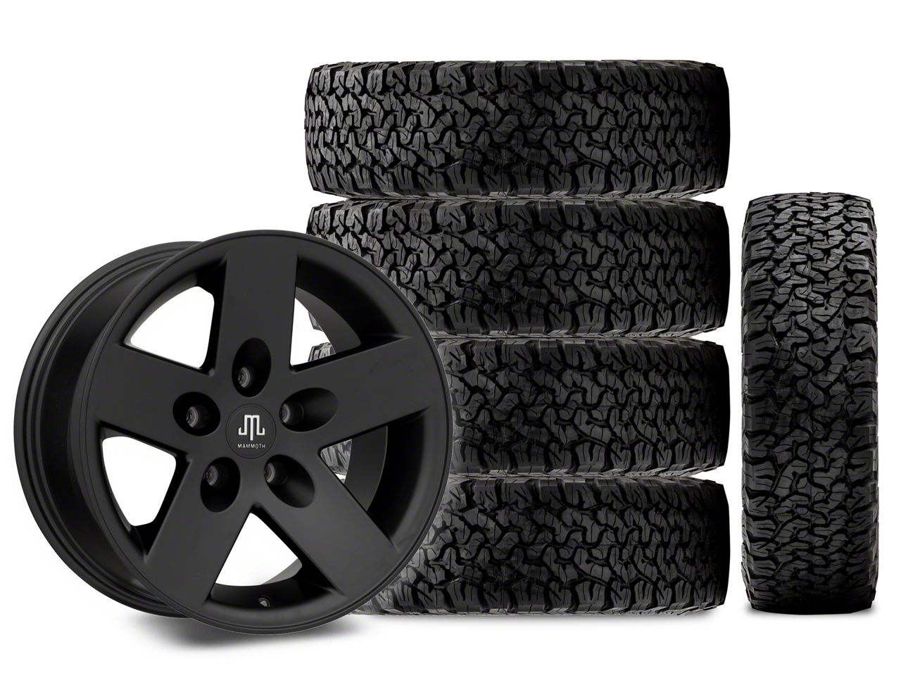 Mounted and Balanced Wheel and Tire Kit. This wheel and tire combo kit features (5) 17x9 Mammoth Moab Black Wheels and (5) BF Goodrich All-Terrain T/A KO2 285/70R17 tires that have been put together into an easy to buy kit that arrives to your door already mounted and balanced ready to be installed on your vehicle.