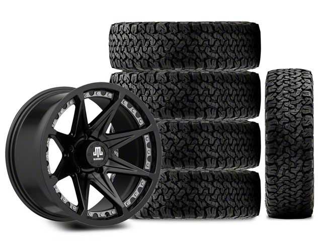 Mounted and Balanced Wheel and Tire Kit. This wheel and tire combo kit features (5) 17x9 Mammoth Type 88 Matte Black Wheels and (5) BF Goodrich All-Terrain T/A KO2 285/70R17 tires that have been put together into an easy to buy kit that arrives to your door already mounted and balanced ready to be installed on your vehicle.