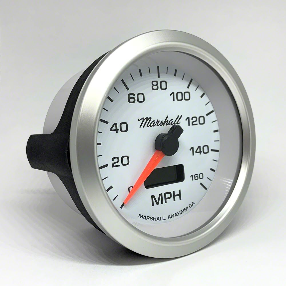Programmable Speedo FeaturesMarshall in-dash speedometers come in 3-3/8" and 5" sizes and a variety of dial colors and bezel options.Marshall speedometers feature two trip meters and an odometer (miles). Marshall speedometers come precalibrated for 16,000 pulses per mile and can be recalibrated at any time for 4,000 - 200,000 pulses per mile using the included trip/calibration button. Calibration is as easy as pressing the included calibration button and driving one measured mile.Marshall electronic speedometers work with hall effect senders, GPS senders and magnetic pickup sensors (VSS). Any speed sender or electronic module that meets the following conditions can be used with our speedo:Pulse range generated proportional to the vehicle speedSignal with minimum 3V peak to peak signal - typical for 3-wire hall effect and 2 wire vehicle speed sensor outputs4000-200,000 pulses per mile (16,000 is typical).Marshall performance in-dash speedometers and tachometers feature high-speed stepper motor movement, LED through-the-dial lighting, red illuminated pointer, and easy-install u-clamp.Made in the U.S.A.This product is proudly made in Anaheim, California USA.Through-Dial LED LightingMarshall gauges feature through-the-dial LED lighting and glowing 3D pointer for a cool look and easy viewing at night.