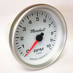 The Marshall 5" in dash tachometer features a high end stepper motor movement and through the dial lighting for easy viewing at night. It is available in 2 dial colors (black and white) and three bezel options: silver aluminum, black aluminum and stainless steel step.Marshall TachometersMarshall in-dash tachometers are available in 3-3/8" and 5" sizes with a variety of dial colors and bezel options. Marshall tachometers come preprogrammed for 4 pulses per revolution (PPR) and can be easily programmed to work with signals ranging from 0.5 PPR to 6 PPR (1-12 cylinders). Marshall tachometers work with a wide variety of ignition types including standard inductive coil (-), HEI, and electronic ignition systems. Marshall performance in-dash tachometers feature high-speed stepper motor movement, LED through-the-dial lighting, red illuminated pointer, and easy-install u-clamp.Through-Dial LED LightingMarshall gauges feature through-the-dial LED lighting and glowing 3D pointer for a cool look and easy viewing at night.